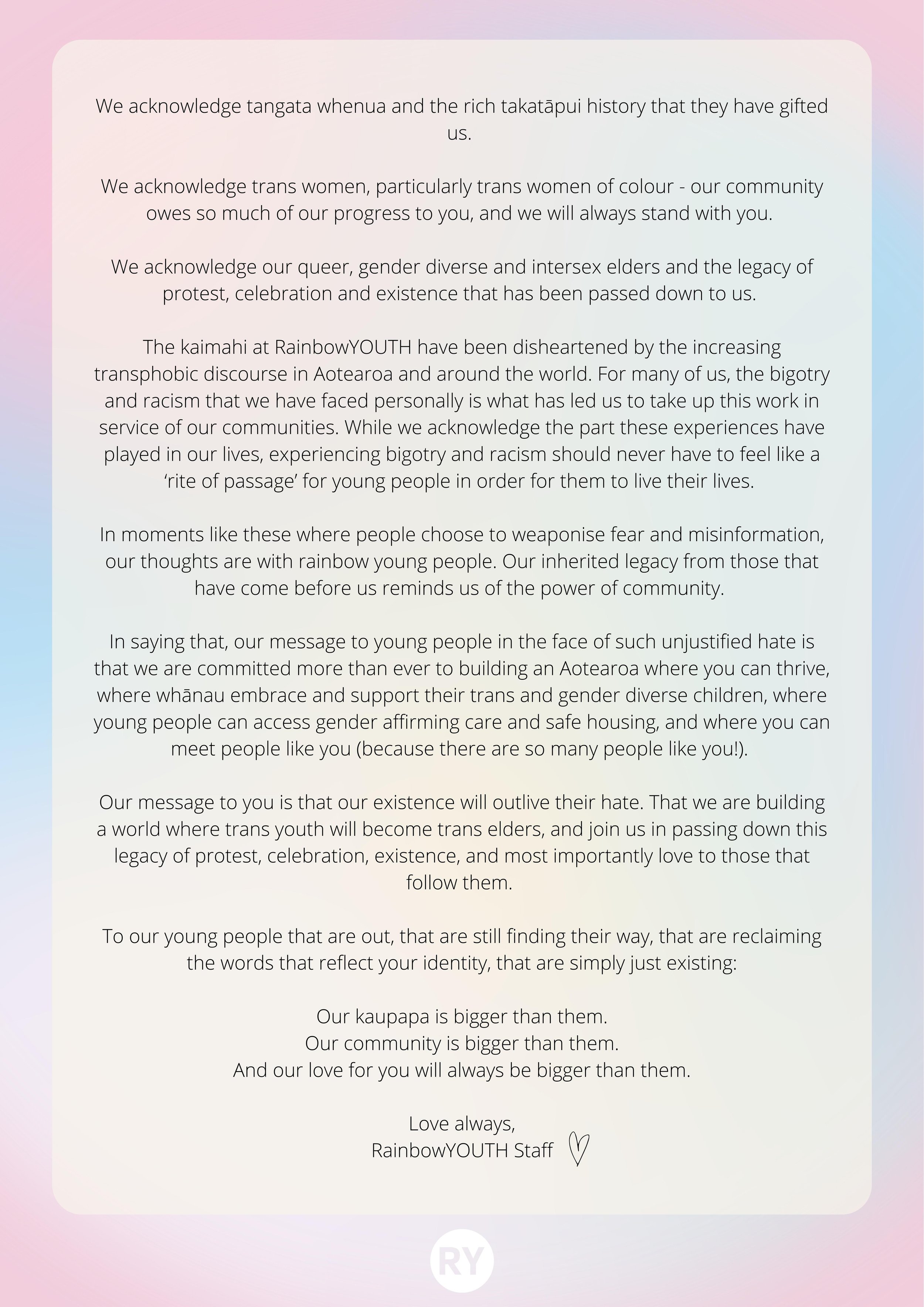 Explore our mission, values, and the ways we support and empower rainbow young people across Aotearoa. Learn how we honor Te Tiriti by understanding, supporting, and empowering rangatahi takatāpui at individual, whānau, and community levels.