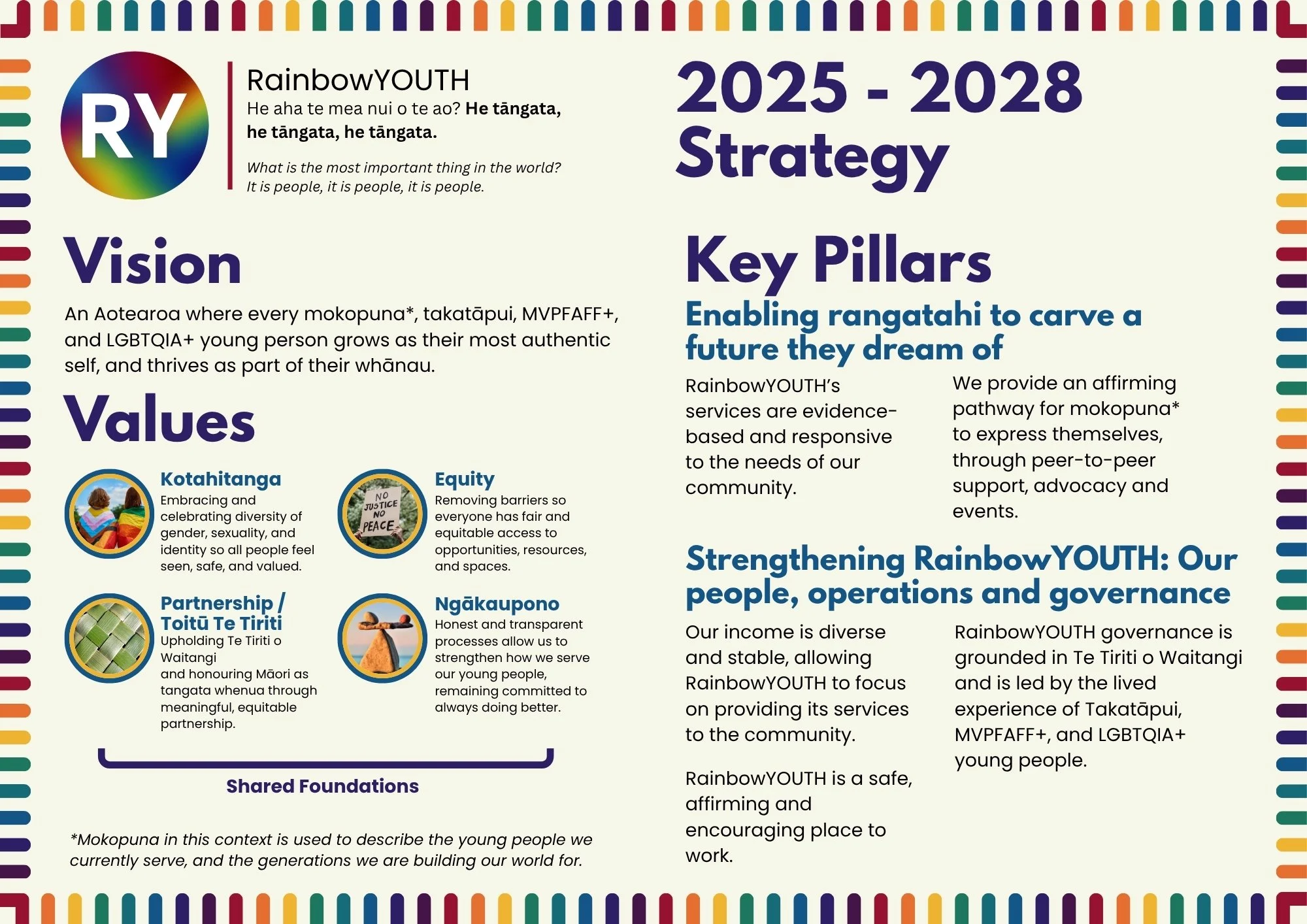This means making sure our income is diverse and stable, allowing RainbowYOUTH to focus on providing its services to the community. It also means making sure RainbowYOUTH governance is grounded in Te Tiriti o Waitangi and is led by the lived experience of Takatāpui, MVPFAFF+, and LGBTQIA+ young people. And finally, we want RainbowYOUTH to be a safe, affirming and encouraging place to work.
